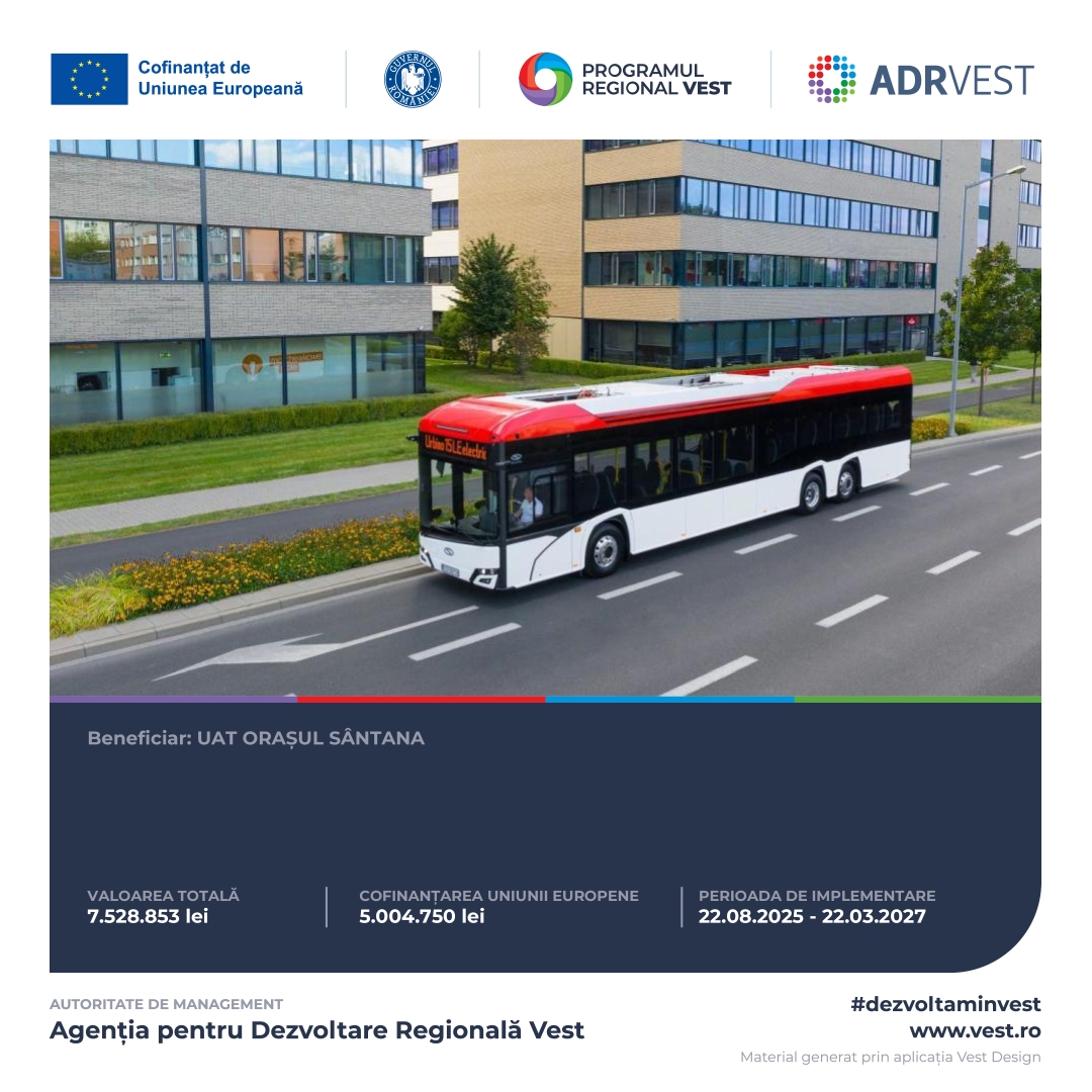 „Proiectul este cofinanțat de Uniunea Europeană, prin ADR Vest în calitate de Autoritate de Management pentru Programul Regional Vest 2021-2027. Pentru informații detaliate despre program, accesați www.vest.ro.”